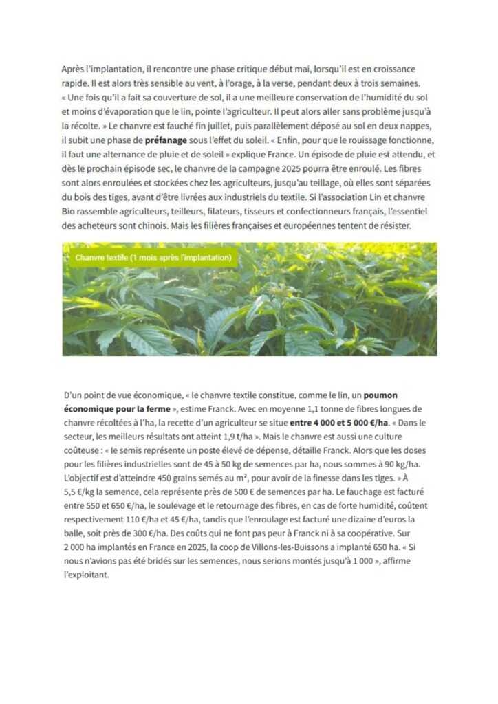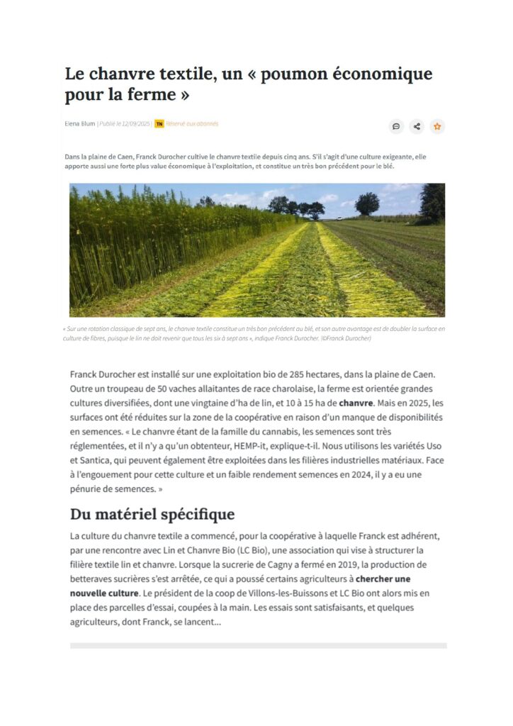 «Depuis 2017, l’association Lin et chanvre bio déploie des essais de chanvre en Normandie, à Villons-les-Buissons et dans le nord de Caen (Calvados). L’objectif ? Créer une nouvelle filière chanvre textile pour remplacer la betterave.