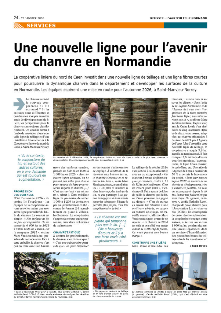 Un article qui met en avant le travail de Lin et Chanvre Bio, La linière du Nord de Caen, La Région Normandie et l’entreprise Hyler pour développer la filière chanvre textile.