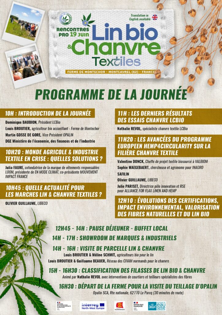 L’association Lin et Chanvre Bio organise ses 11e Rencontres Interprofessionnelles des filières textiles lin bio et chanvre le jeudi 19 juin 2025 sur la Ferme de Montechor qui cultive du lin et du chanvre en agriculture biologique à Montcavrel (62) près du Touquet.